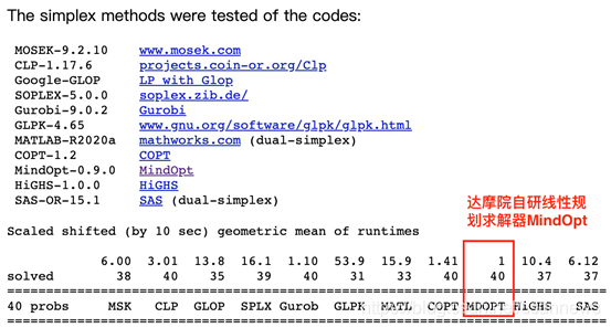 图为Mittelmann榜单公布的测评成绩,“40”是指MindOpt成功求解了全部40个线性规划问题,同时MindOpt求解速度最快,其求解时间作为基准时间“1”
