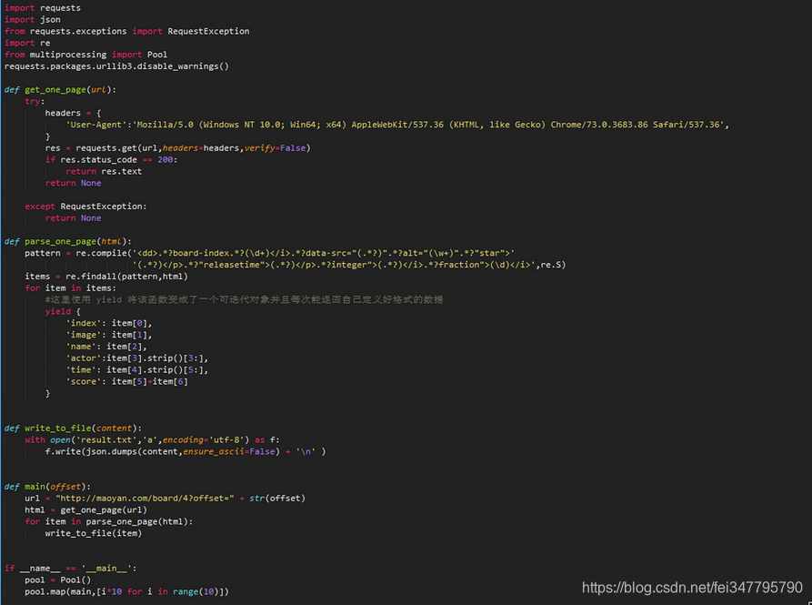 看完以后我们的思路应该就比较清晰了,我们首先使用 requests 库请求单页内容,然后我们使用正则对我们需要的信息进行匹配,然后将我们需要的每一条信息保存成一个JSON 字符串,并将其存入文件当中,然后就是开启循环遍历十页的内容或者采用 Python 多线程的方式提高爬取速度