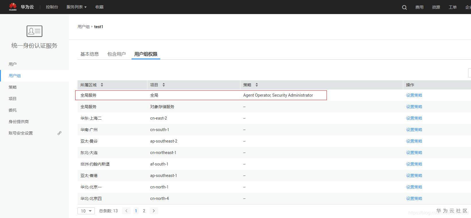 步骤 1:创建账号I**mainA下的IAM用户userB,并授予Security Administrator和Agent Operator权限(全局服务-全局项目)。