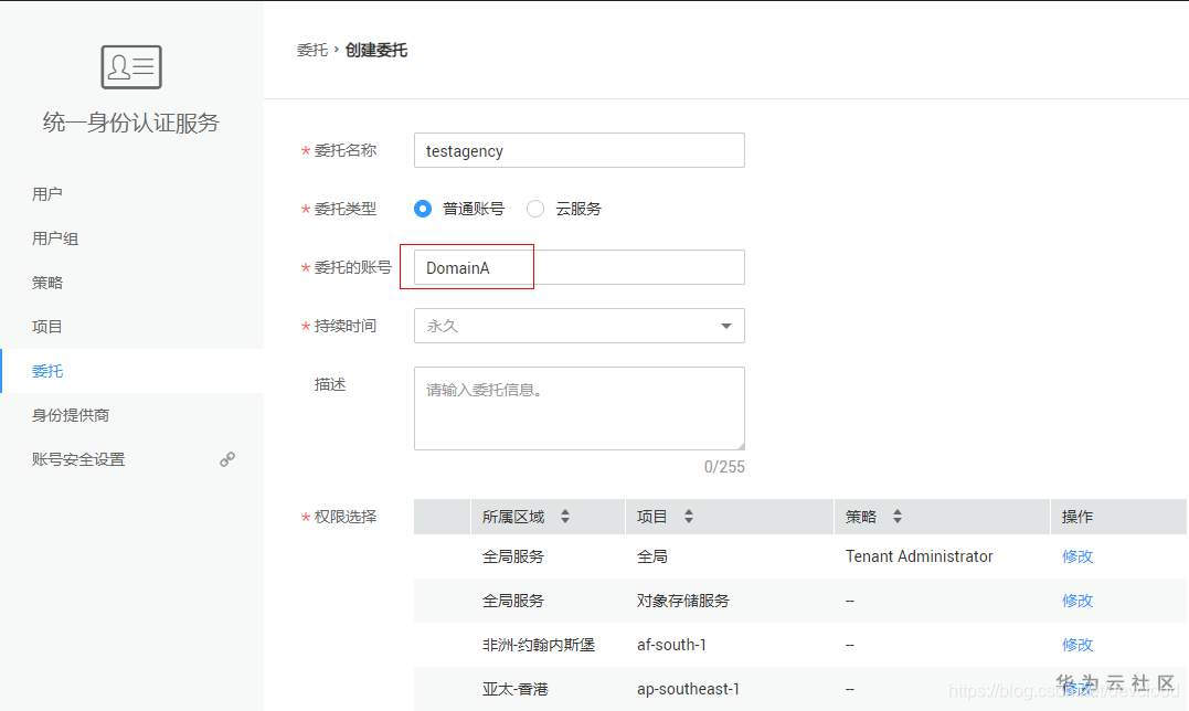 备注:有关创建委托相关操作请参见:创建委托(委托方操作)(https://support.huaweicloud.com/usermanual-iam/zh-cn_topic_0046613147.html)